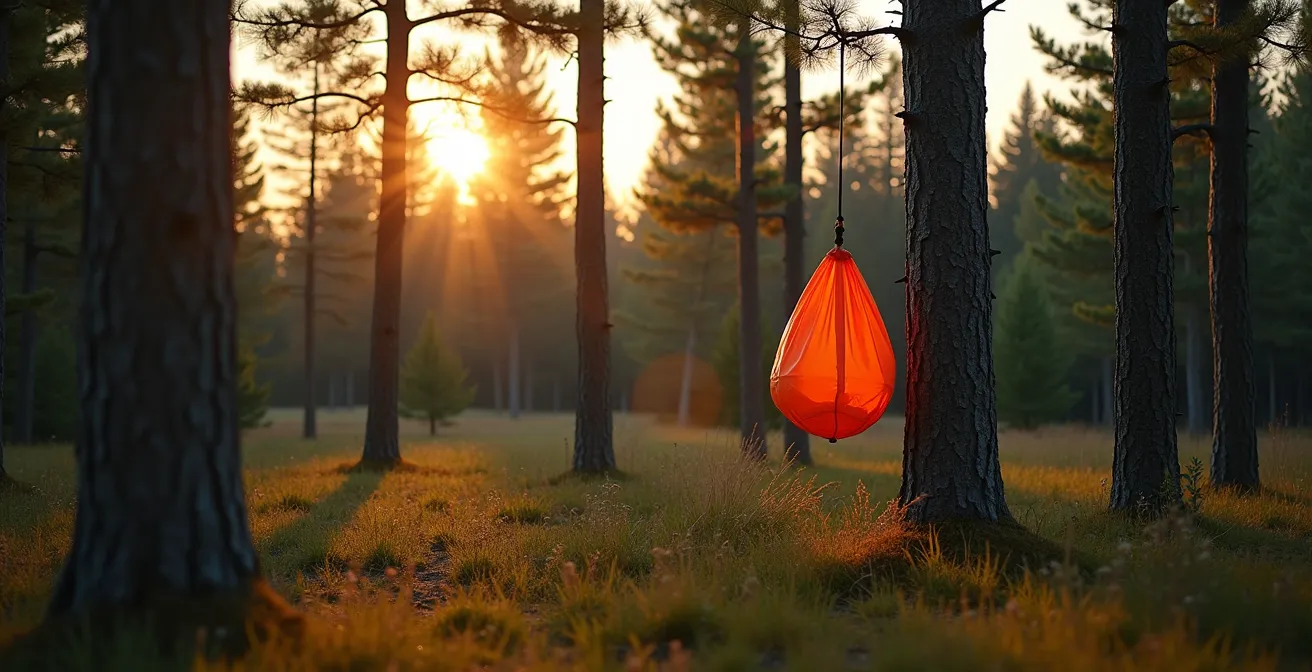 Le principe fondamental est la dissociation. Votre campement doit être organisé en un triangle de sécurité : la zone de sommeil (tente), la zone de cuisine (où les odeurs sont générées) et la zone de stockage de la nourriture doivent être distantes d’au moins 100 mètres les unes des autres. La suspension de la nourriture est l’étape finale de ce principe. Il ne s’agit pas juste de « mettre en hauteur », mais de rendre le sac inaccessible de toutes les directions : depuis le sol, en grimpant au tronc, et en sautant depuis une branche.